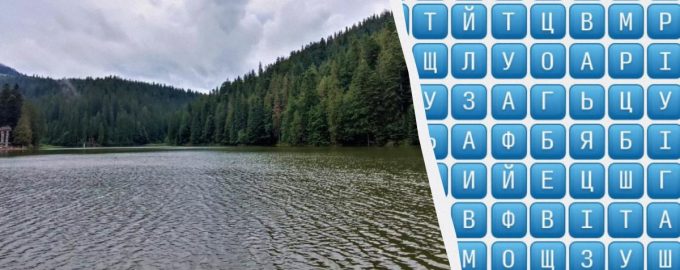 Nedan ser du ett collage med dussintals bokstäver. De är ordnade där i en godtycklig ordning. Någonstans bland detta kaos har vi gömt ordet ”Synevir”. Detta är den största bergsjön i Ukraina. Den ligger i Khust-distriktet i Transkarpatien-regionen.