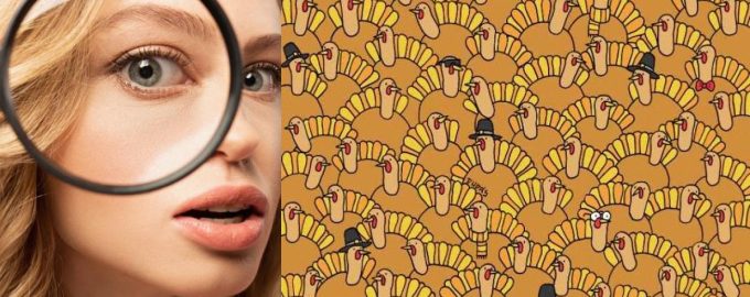 En färgglad bild inbjuder dig att hitta en pumpa gömd bland kalkonerna. Titta noga på bilden och uppskatta hur snabbt du kan hitta pumpan i den här bilden. Uppgiften blir ännu mer intressant om du bara ger dig själv 7 sekunder på dig att hitta det gömda elementet.