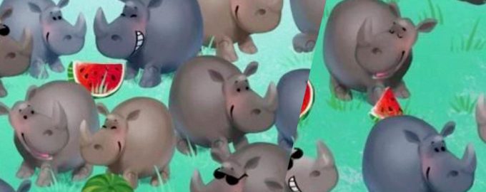 För vissa av er kommer det att vara svårt att upptäcka flodhästen, men om du tittar på djurets ansikte till höger ser du omedelbart att ett av djuren har en annan näsa än noshörningarna.