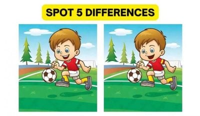 Bilden visar en pojke som spelar fotboll. Även om de två bilderna vid första anblicken ser likadana ut, är de inte det. Det finns fem skillnader mellan de två bilderna.