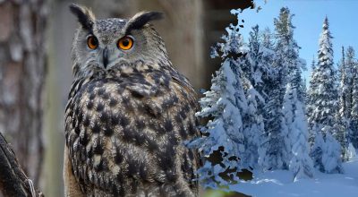 Någonstans bland denna vinternatur gömmer sig en uggla. Vid första anblicken verkar det som om det inte finns några djur på bilden, men så är inte fallet. Fågeln är så väl förklädd att endast den mest uppmärksamme kan upptäcka den.