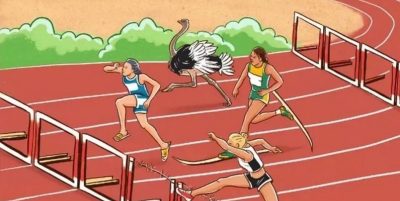 På bilden ser vi idrottare som springer på en sträcka med hinder. Men om man tittar närmare blir det tydligt att allt på bilden inte är som det ska. Några av de saker vi ser är fel. Vi måste identifiera och namnge dessa få misstag.