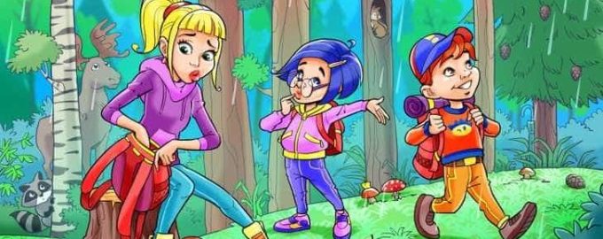 På bilden ser vi en mamma med två barn som promenerar i skogen. När det plötsligt börjar regna börjar mamman leta efter ett paraply i sin ryggsäck. Men hon hittar det inte, för de måste ha tappat det någonstans på vägen. Medan mamman oroligt letar efter paraplyet njuter barnen av att titta på regndropparna.