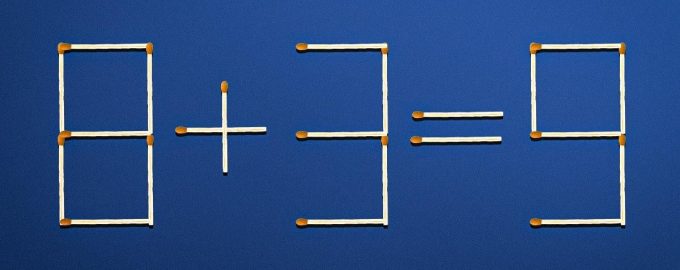 I illustrationen nedan ser du ett matteexempel som består av tändstickor: 8+3=9. Som du kan se är det felaktigt. Men flytta bara en tändsticka till en annan plats så kommer likheten att bli sann.