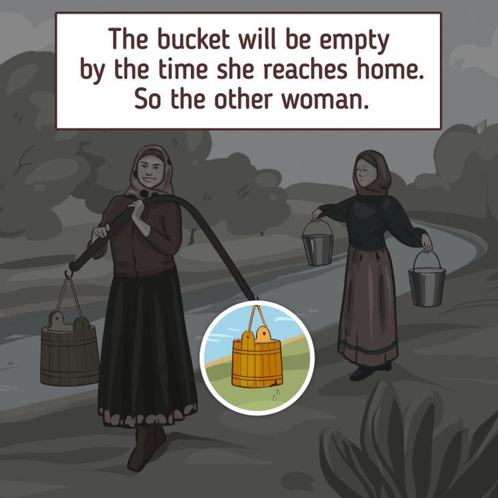 På bilden ovan kan du se att två kvinnor bär två hinkar med vatten var på sina axlar. Kvinnorna har fyllt hinkarna med vatten från en närliggande flod. Båda bär hem de fyllda hinkarna. Men kan du säga vilken kvinna på bilden som tar med sig mest vatten hem?