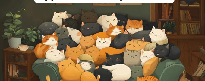 Nedan ser du en bild med katterna – alla utom en är leksakskatter. Men först ska vi ge dig bakgrundshistorien, den är viktig. Innan den håriga skönheten lade sig på soffan hade den varit i köket, ätit sig mätt och bestämt sig för att hitta en mysig plats att sova på.